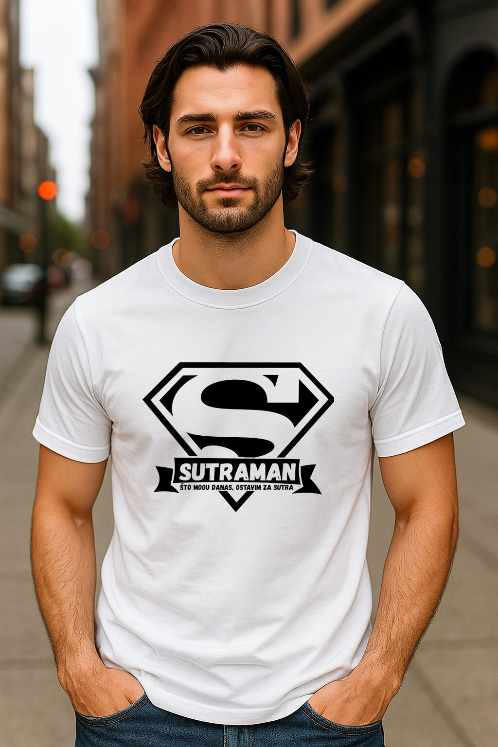 Predstavljamo vam atraktivnu pamučnu majicu inspirisanu legendarnim simbolom superheroja, ali sa originalnim, duhovitim twistom – “Sutraman”. Napravljena od kvalitetnog 100% pamuka, ova majica pruža izuzetan komfor, prozračnost i dugotrajnost, idealna za svakodnevno nošenje. Na prednjoj strani nalazi se upečatljiv print koji asocira na prepoznatljiv “S” znak, ali u kreativnoj verziji koja šalje poruku o opuštenosti, duhovitosti i životnom stavu “sutra je novi dan”. Ilustracija je urađena u jarkim, postojanim bojama, otporna na pranje, a sam dizajn privlači poglede i izmamjuje osmeh. Majica je uniseks kroja, dostupna u više veličina, i savršena je kao poklon za prijatelje ili za ličnu garderobu. “Sutraman” majica je spoj udobnosti, kvaliteta i humora – savršen izbor za one koji vole da se istaknu i pokažu svoj vedar duh.