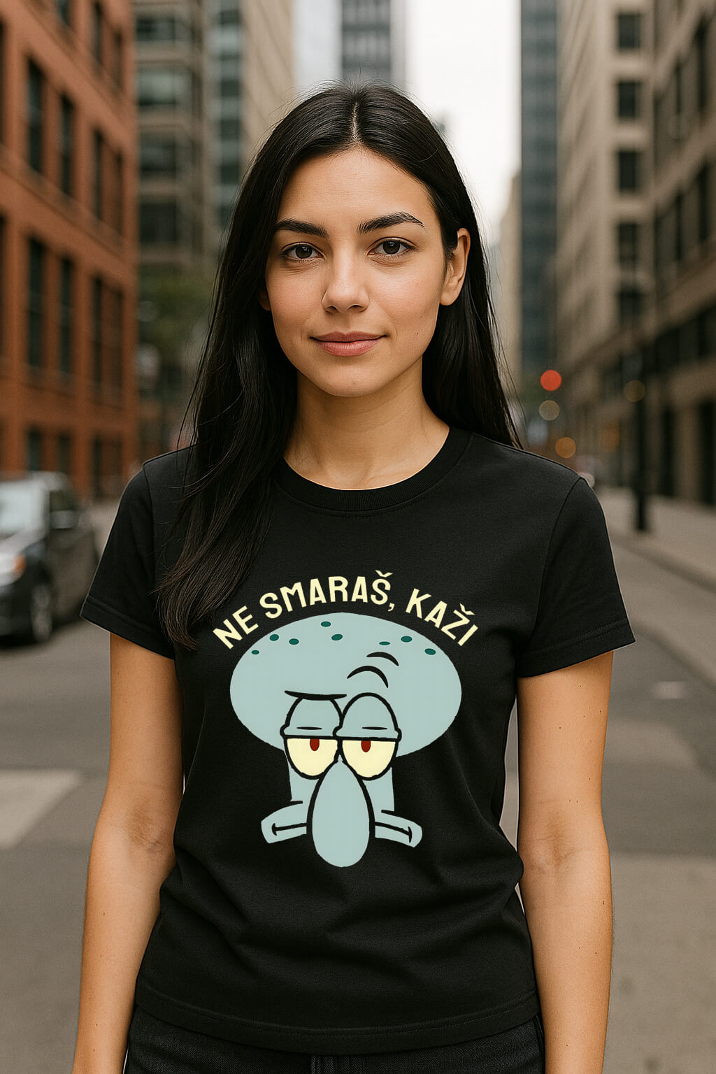 Pamučna majica sa natpisom „Ne smaraš, kaži“ predstavlja savršen spoj udobnosti, kvaliteta i stava. Izrađena je od 100% visokokvalitetnog pamuka, mekana na dodir i prijatna za nošenje tokom celog dana. Ilustracija je pažljivo odštampana savremenom tehnikom, što garantuje postojanost boja i otpornost na pranje, bez gubitka intenziteta. Dizajn nosi jasnu i duhovitu poruku – ohrabruje otvoren razgovor i iskrenost, uz dozu šarma i samopouzdanja. Savršena je za svakodnevne prilike, izlazak sa društvom ili opuštenu šetnju, a može biti i originalan poklon za nekoga ko voli da se izrazi na kreativan način. Klasičan kroj i kvalitetna izrada osiguravaju dugotrajnost i udobno pristajanje, dok uniseks model odgovara različitim stilovima i kombinacijama. Bilo da je nosite uz farmerke, šorts ili suknju, ova majica će privući pažnju i izmamiti osmeh, uz jasnu poruku: budi direktan, reci šta misliš.